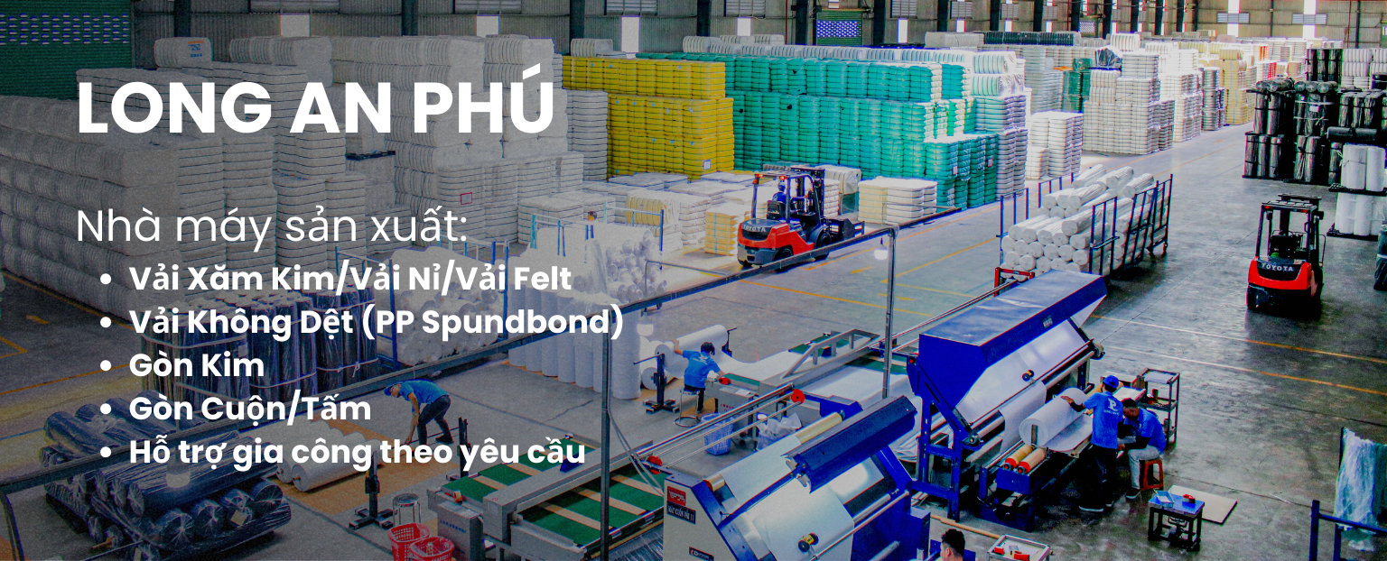 Là một trong những đơn vị hàng đầu sản xuất và cung cấp vải không dệt xăm kim (vải nỉ, vải felt, needle punched nonwoven), ứng dụng trong các ngành công nghiệp may mặc, giày da, lót ghế sofa, làm thảm lót sàn nhà, văn phòng, sự kiện, hội nghị, sản phẩm lót giày dép, trang trí nội thất xe hơi, may túi trồng cây….